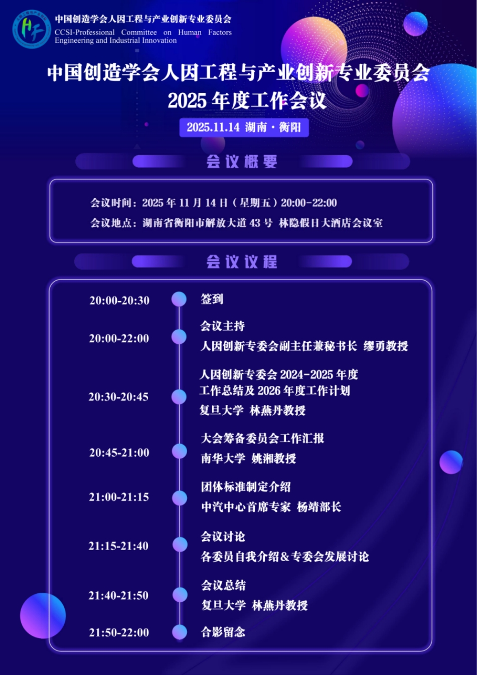 人因工程与产业创新专委会年度工作会议、大会筹备委员会准备工作汇报(20:00-22:00);地点:林隐假日大酒店会议室