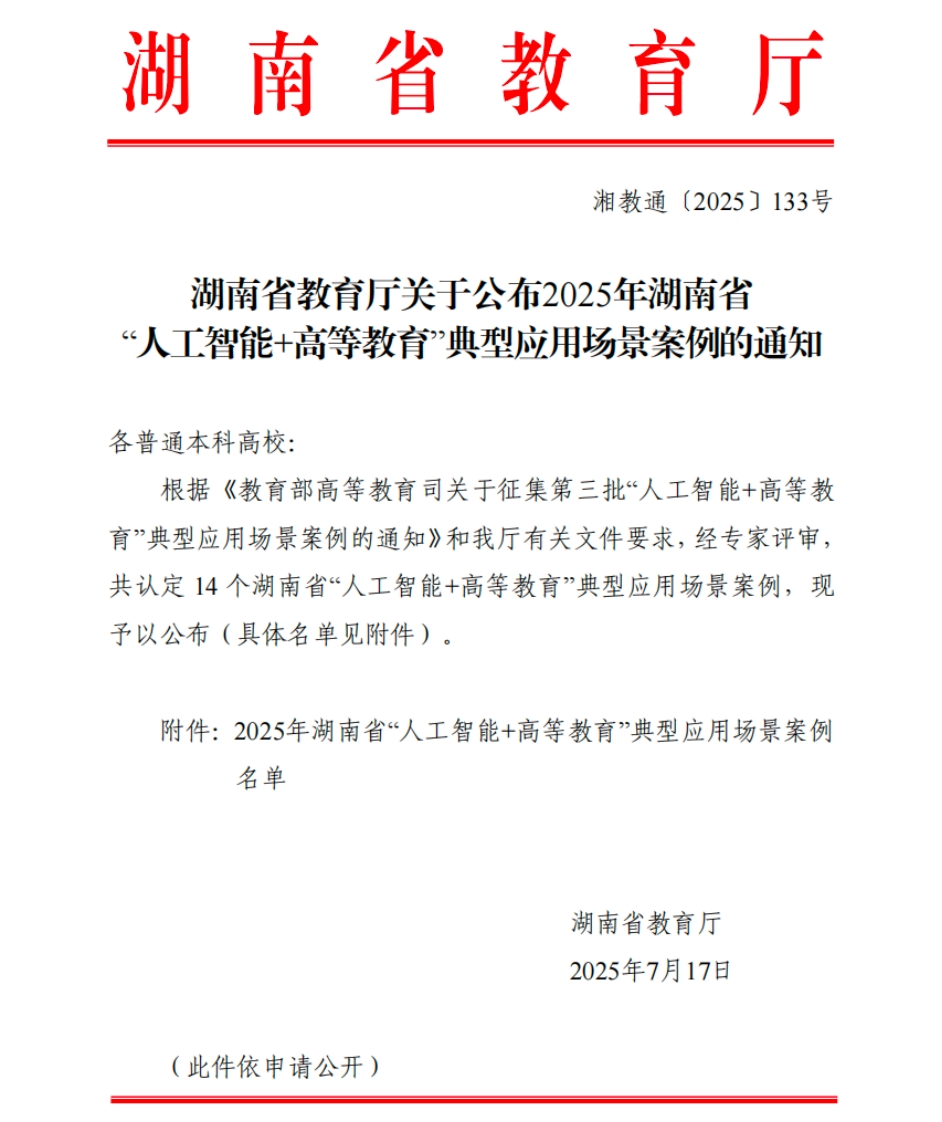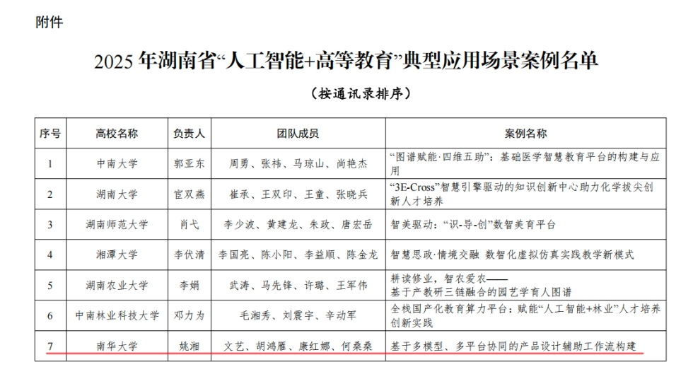 近日,湖南省教育厅印发《关于公布2025年湖南省“人工智能+高等教育”典型应用场景案例的通知》(湘教通〔2025〕133号),bw必威西汉姆联官网教学案例《基于多模型、多平台协同的产品设计辅助工作流构建》成功入选,成为全省14个典型应用场景案例之一。