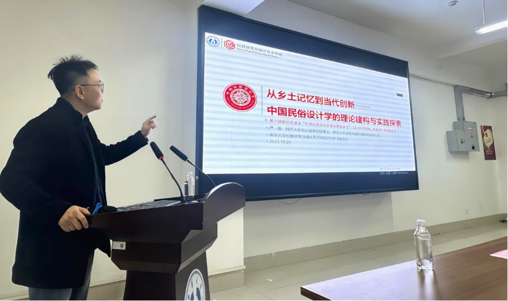 2025年10月21日,严康博士应邀来bw必威西汉姆联官网作“从乡土记忆到当代创新 —— 中国民俗设计学的理论建构与实践探索”专题讲座。讲座由学院院长姚湘主持,师生代表共100余人参与。