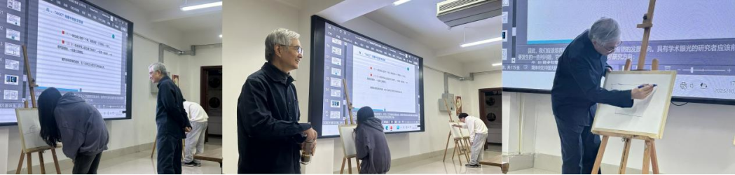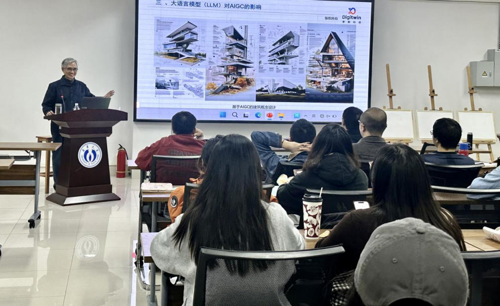 围绕人工智能生成内容(AIGC)这一前沿议题,田教授从技术原理与创作实践两个维度展开深入剖析。他通过具体案例展示了人机协同创作的潜力,启发师生们关注技术背后的人文关怀与哲学思辨。在互动环节中,田教授亲自示范设计创作,并详细回答了大家的问题。
